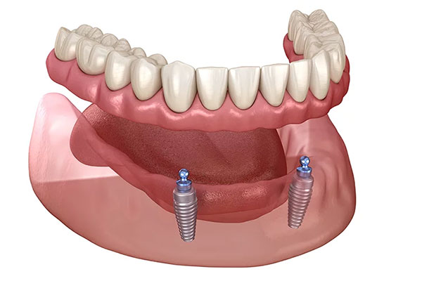 ロケーター義歯とは、2本のインプラントで入れ歯を支える入れ歯治療です。